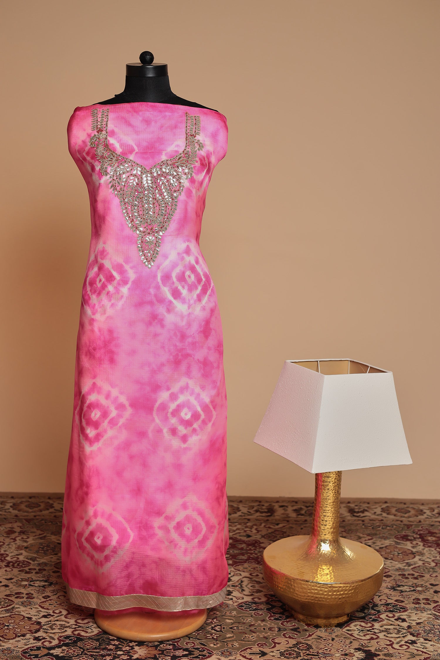 Pink Chanderi Silk Unstitched Suit Set, Embroidered Salwar Kameez Material