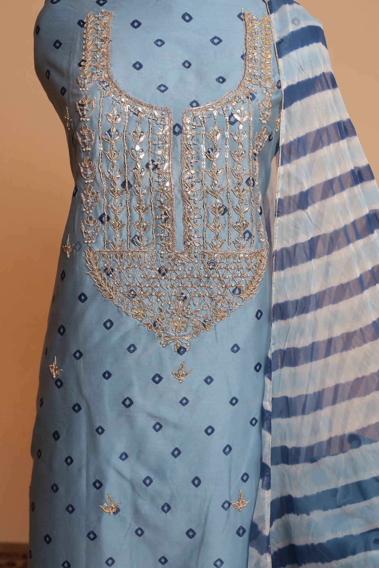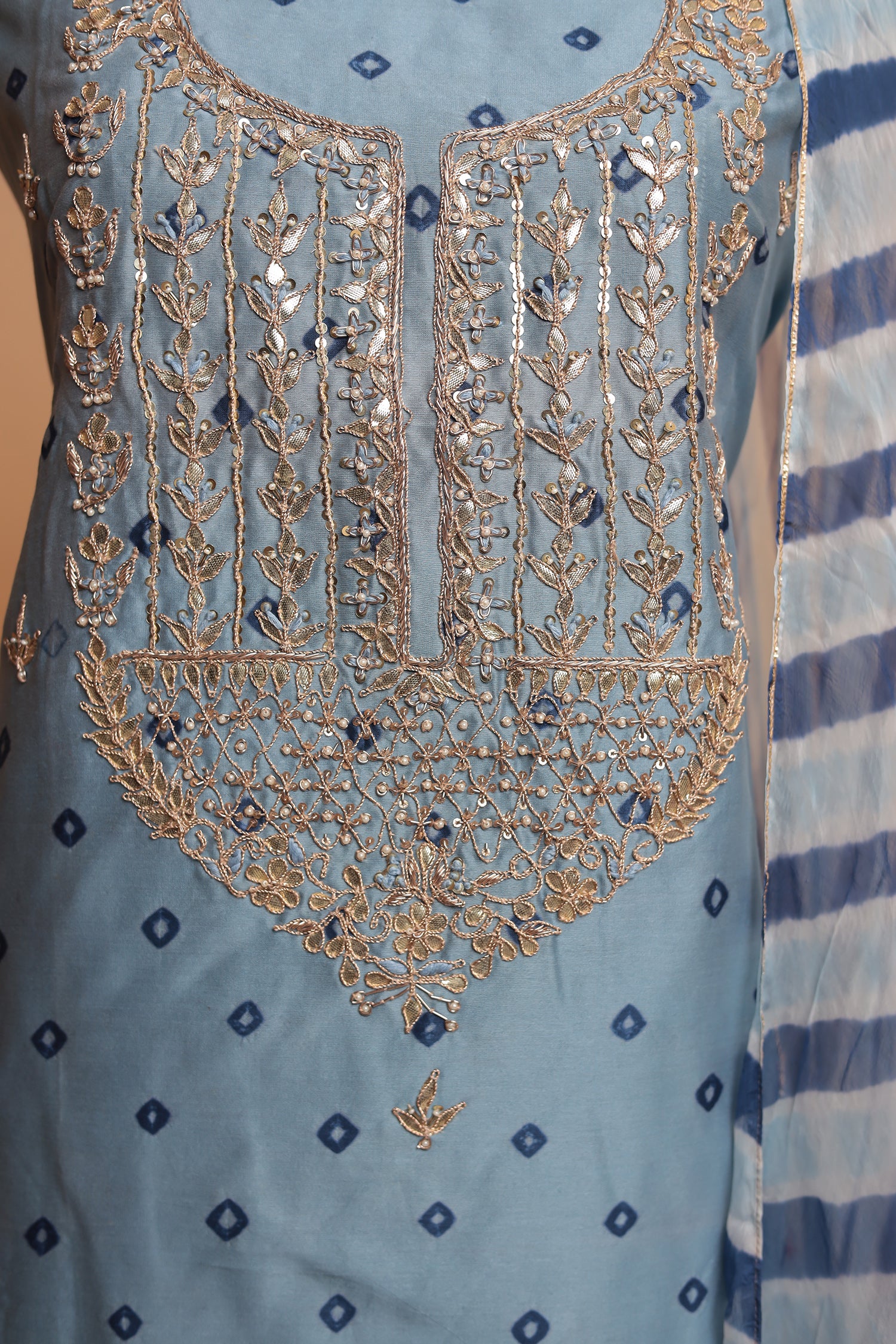 Introducing our elegant Dusty Blue Pure Silk Unstitched Suit Set, a true statement of grace. This suit features a beautiful, subtle Bandhani (Tie-Dye) print scattered across the kurta body, creating a soft, textured look. The focal point is the Heavy Neckline, meticulously adorned with dazzling Mirror Work and intricate Silver Zari embroidery, making it perfect for formal events and high-end parties. The luxurious Pure Silk fabric ensures a rich drape and comfortable feel. It comes complete with a stunning Striped Organza Dupatta, offering a contemporary edge. This is the perfect Designer Silk Suit for those who appreciate understated luxury.