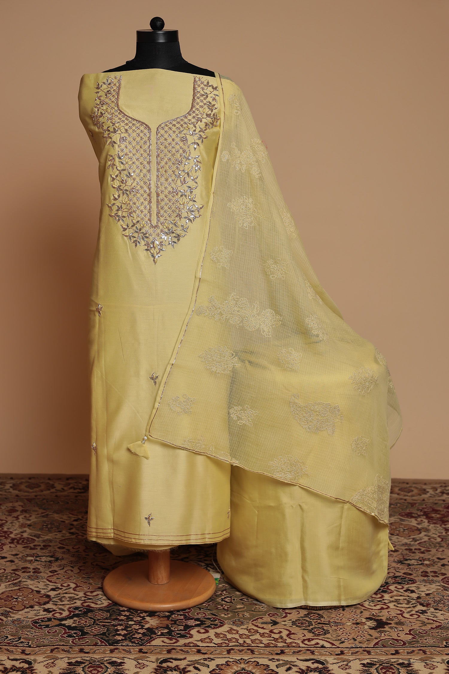 Discover timeless sophistication with our Elegant Sage Green Pure Silk Unstitched Suit Set. This suit is perfect for those seeking traditional charm without the shimmer of mirror work, making it ideal for formal events, festive gatherings, and as a stylish Wedding Guest Outfit. The Pure Silk fabric ensures a luxurious feel and a comfortable, graceful fall. The focal point is the Heavy Zari Work Neckline, meticulously detailed with shimmering Sequins and threadwork. This elegance is carried through to the embroidered dupatta, giving the whole ensemble a rich, coordinated look. Shop this Designer Sage Green Suit and invest in a high-quality piece of Formal Ethnic Wear.