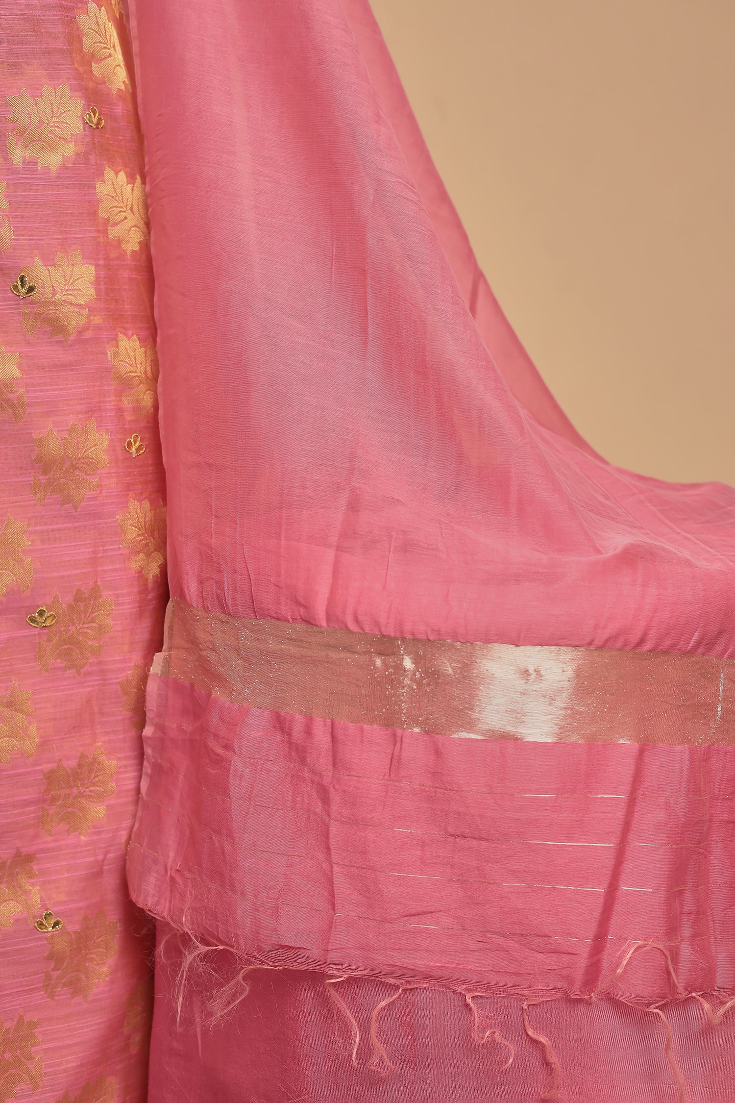 Elevate your ethnic wardrobe with this exquisite Pink Banarasi Tissue Silk Unstitched Suit Set. A true embodiment of traditional Indian craftsmanship, this three-piece dress material allows you to create a personalized, stunning outfit.