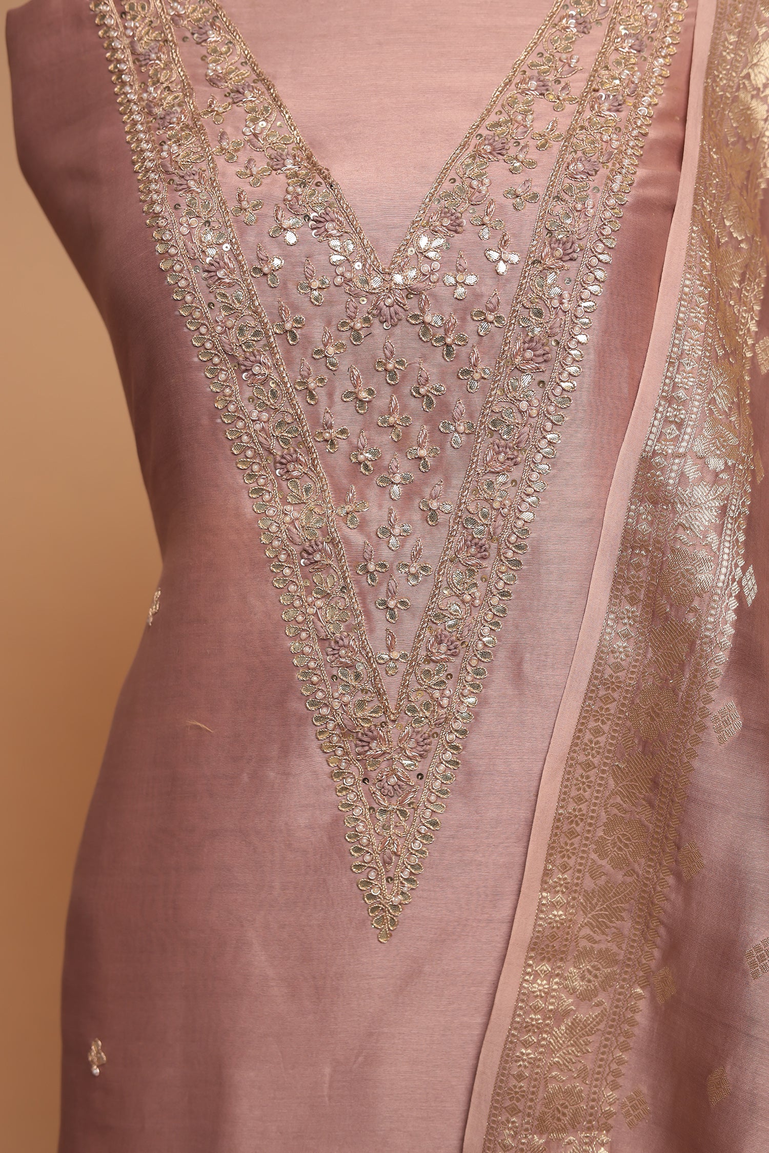 Pastel Chanderi Unstitched Salwar Suit: Light Pink, Pista Green & Gold | Intricate Neck Handwork & Woven Dupatta
