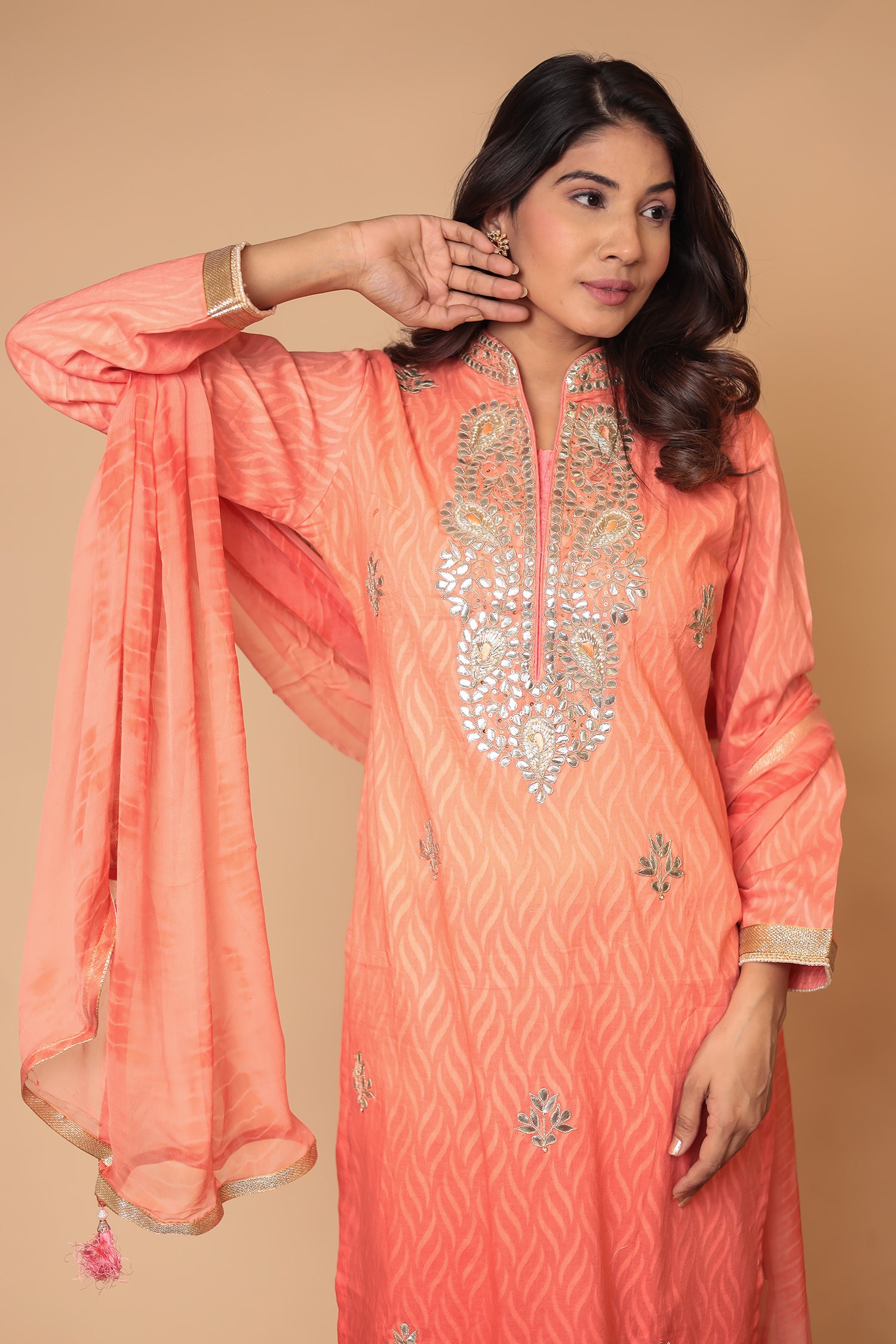 Refresh your festive wardrobe with this Peach Pure Chanderi Silk Suit Set, a perfect choice for day-to-evening occasions. The kurta is crafted from authentic chanderi silk featuring a soft self-pattern weave and subtle embroidery, offering a blend of sophistication and comfort.