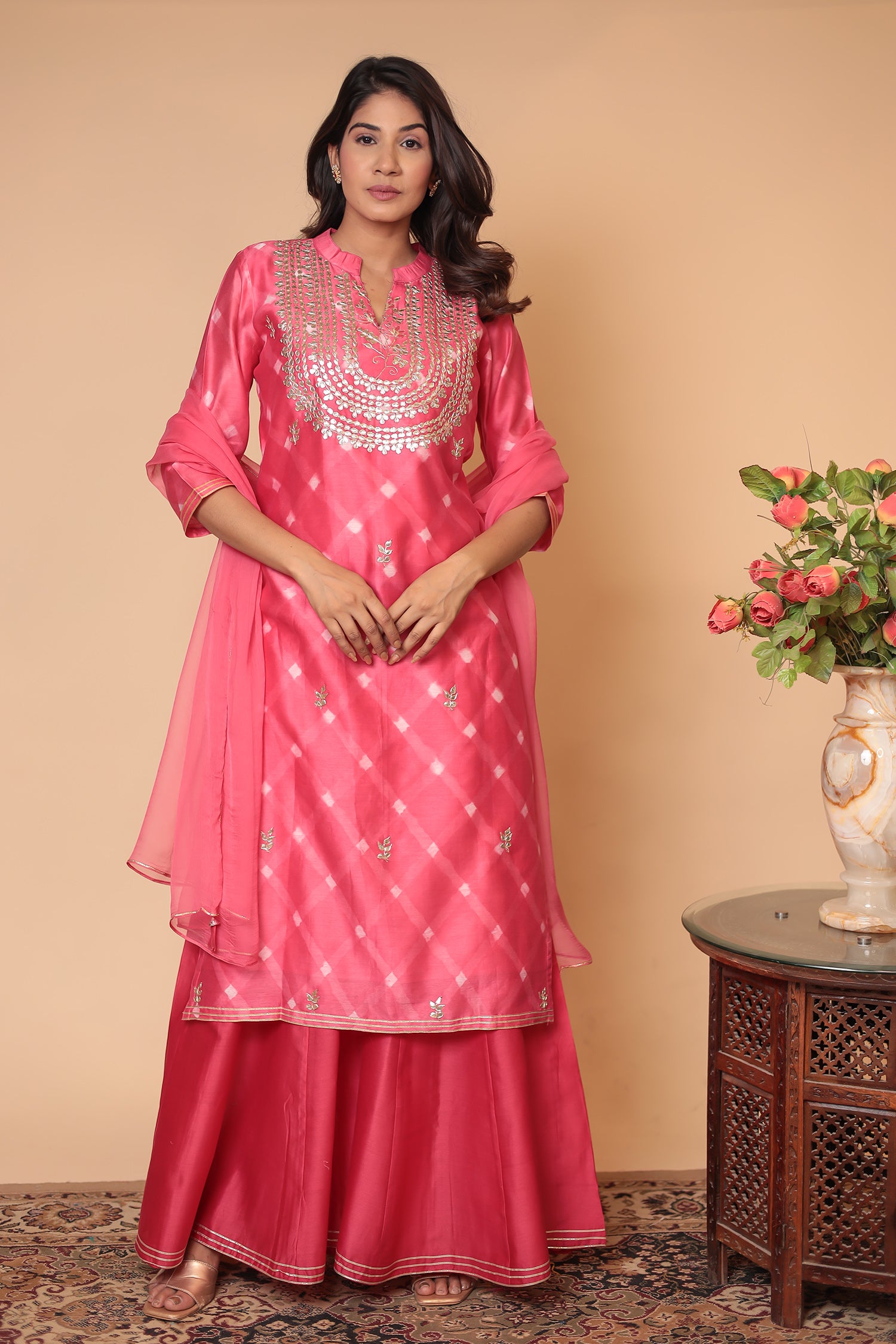 Elevate your festive and wedding wardrobe with this handcrafted pink Chanderi silk sharara set featuring exquisite traditional Zardozi embroidery. Designed for elegance and comfort, this three-piece outfit is perfect for wedding guests, mehndi functions, engagement parties, and festive celebrations.