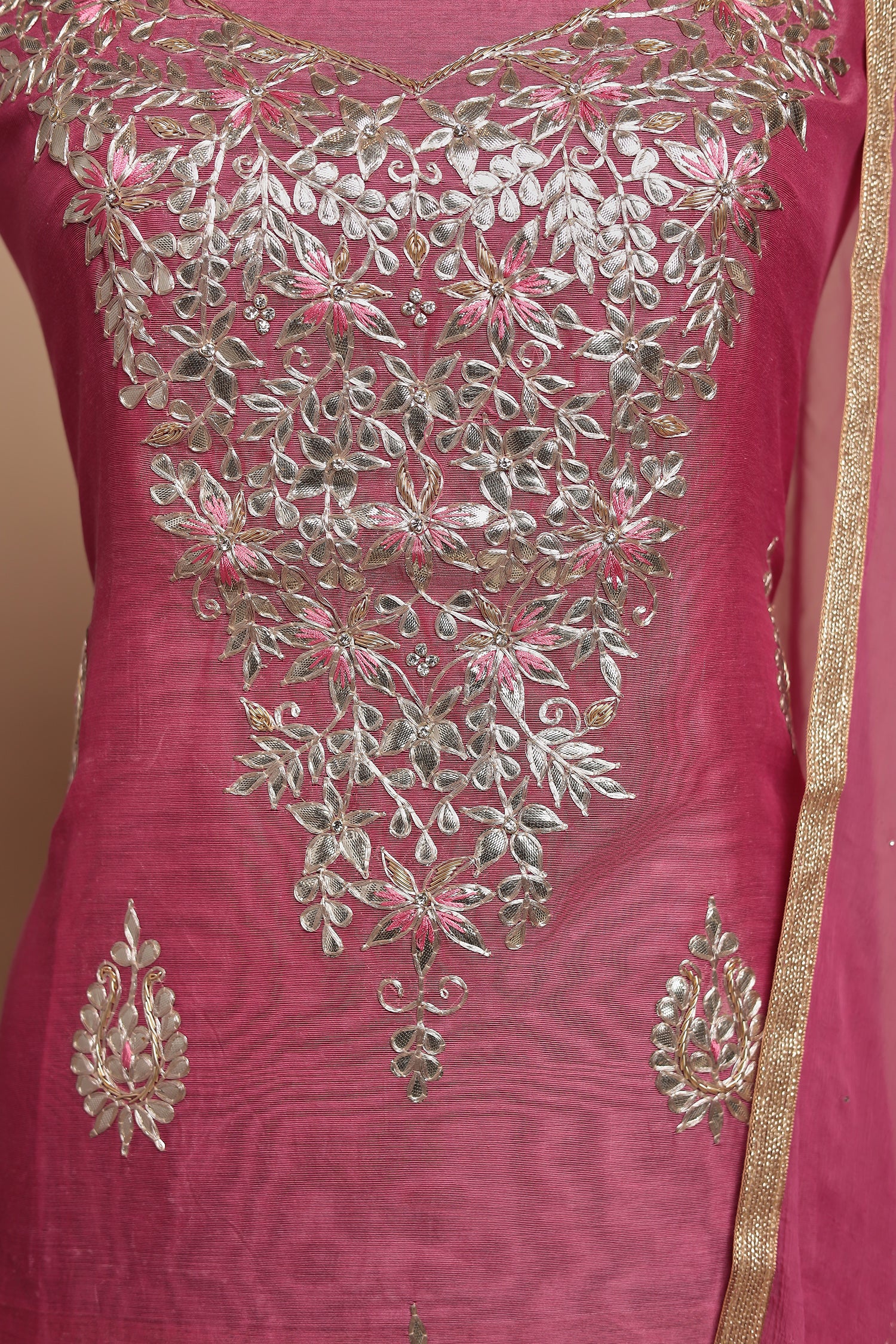 Pink Chanderi Silk Unstitched Suit Set, Zari Work Salwar Kameez
