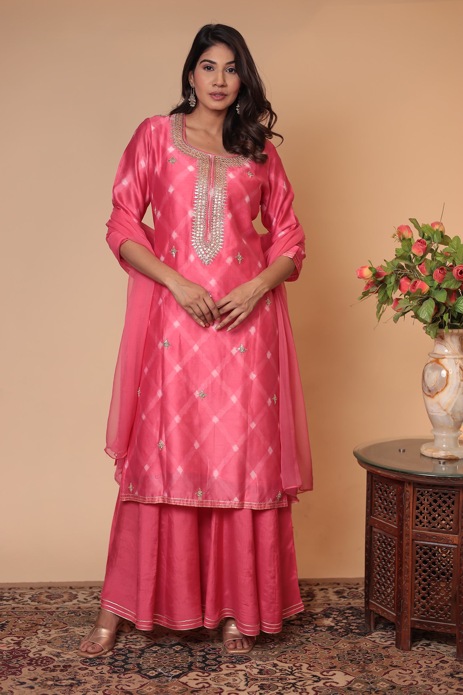 Add a pop of color to your festive wardrobe with this pink kurta sharara set with dupatta. Perfect for weddings, haldi, mehndi, or festive gatherings, this outfit features: