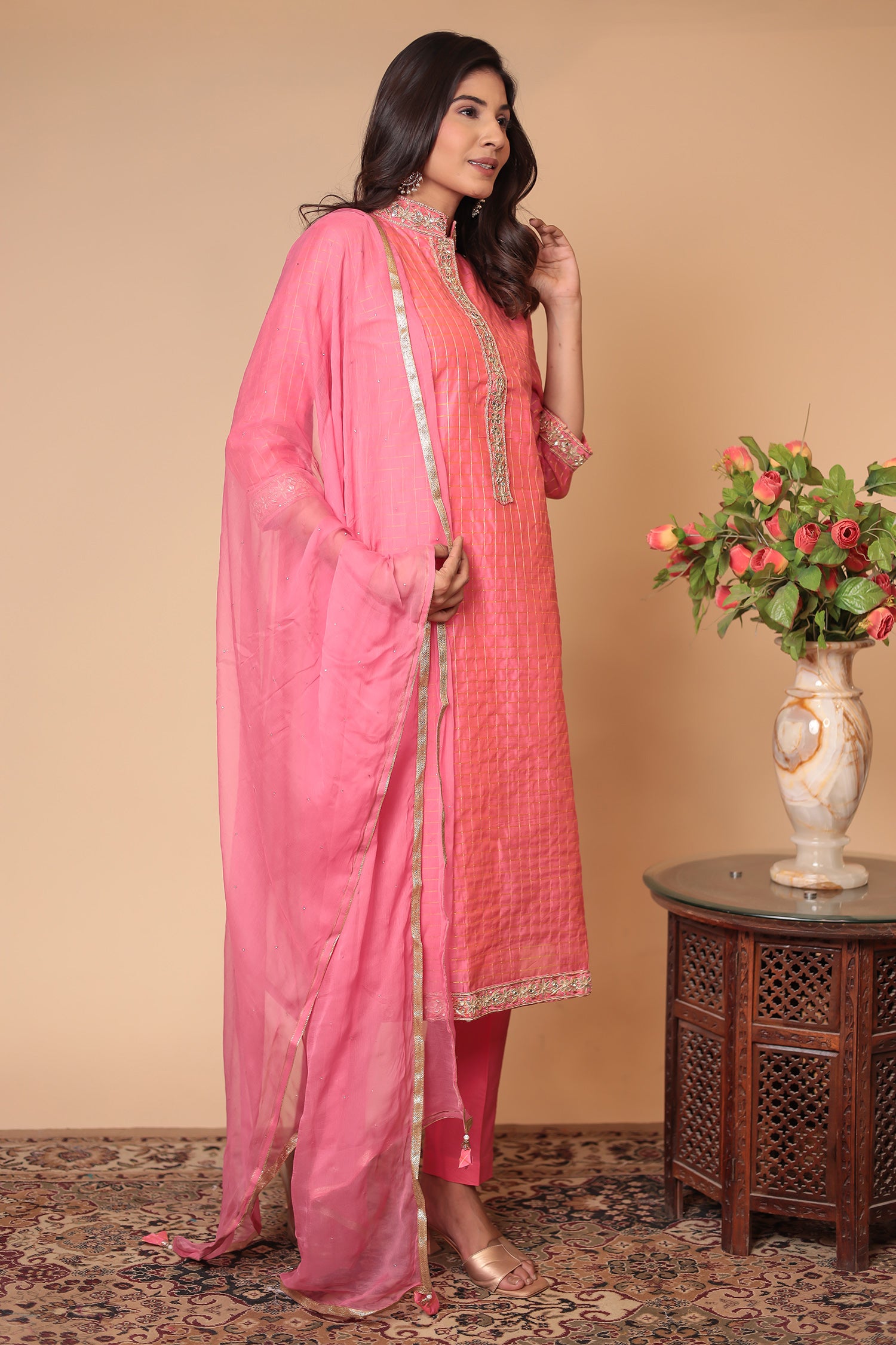 This pink silk-blend straight kurta set is a perfect choice for festive and semi-formal occasions. The kurta features elegant zari and gota detailing on the neckline and cuffs, paired with matching churidar pants and a soft, flowy organza dupatta.