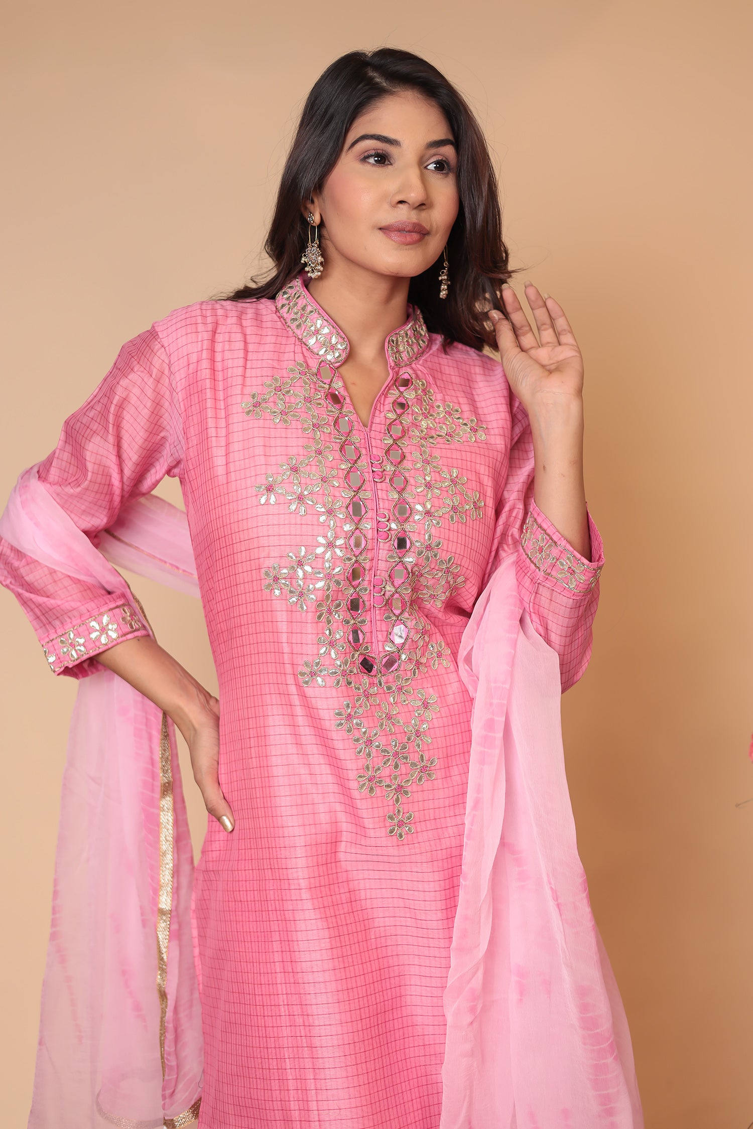 ✨ BULSHNAAZ Pink Zardozi Work Kurta Set ✨ Elevate your ethnic style with this stunning pink kurta set featuring intricate zardozi embroidery on the neckline and front. This outfit is perfect for weddings, engagement parties, festive events, and special occasions. What’s Included:Kurta: Pink kurta with hand-done zardozi embroidery and thread detailing Bottoms: Straight-fit pants for a chic and elegant look Dupatta: Soft matching dupatta with delicate border finish Perfect For: Wedding Guest Outfit Engagement Party Wear Mehndi & Haldi Ceremony Sangeet & Family Functions Diwali, Eid & Festive Gatherings Fabric & Care:Fabric: Soft Silk Blend (Kurta & Pants), Chiffon (Dupatta) Work: Hand Zardozi Embroidery Care: Dry Clean Only