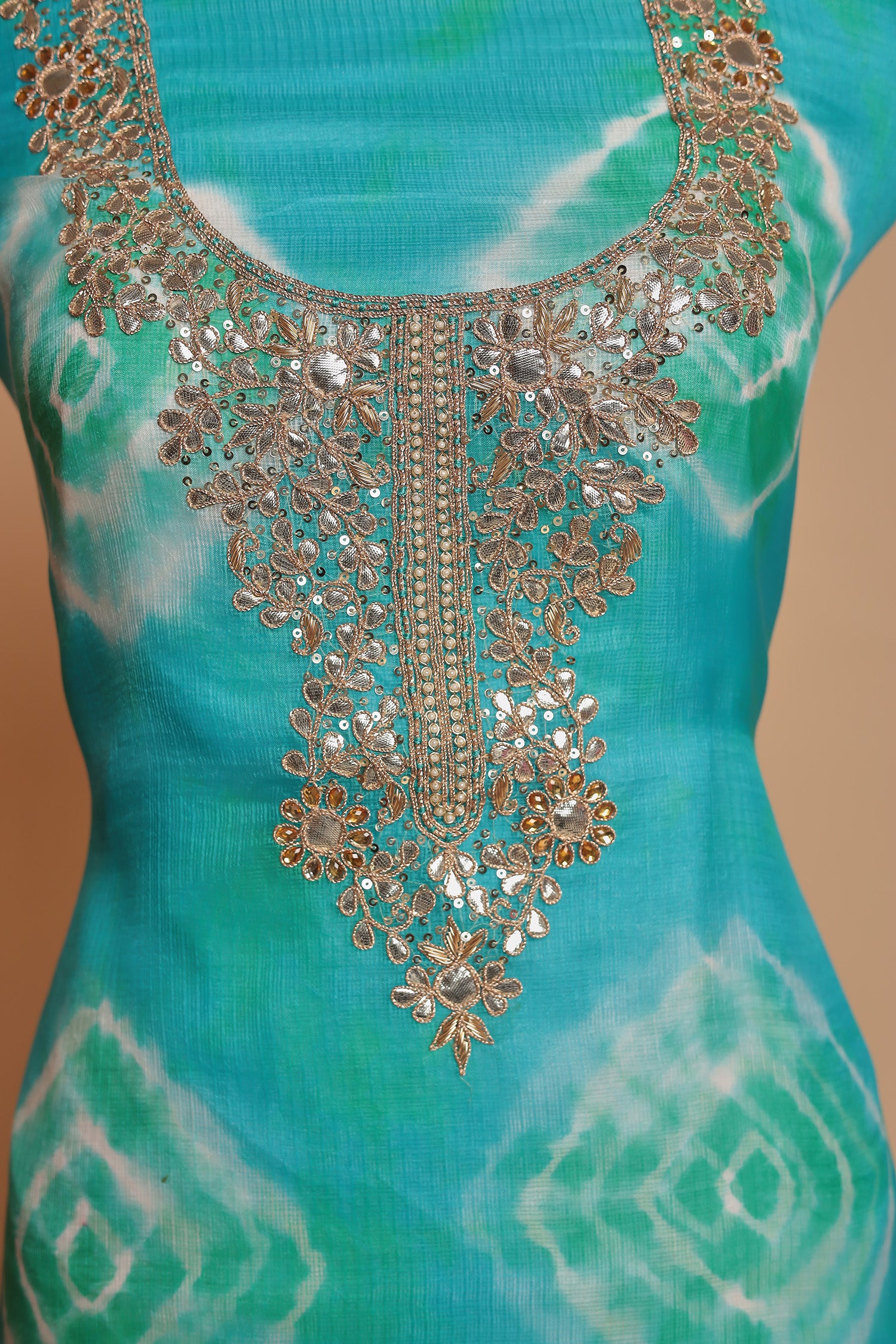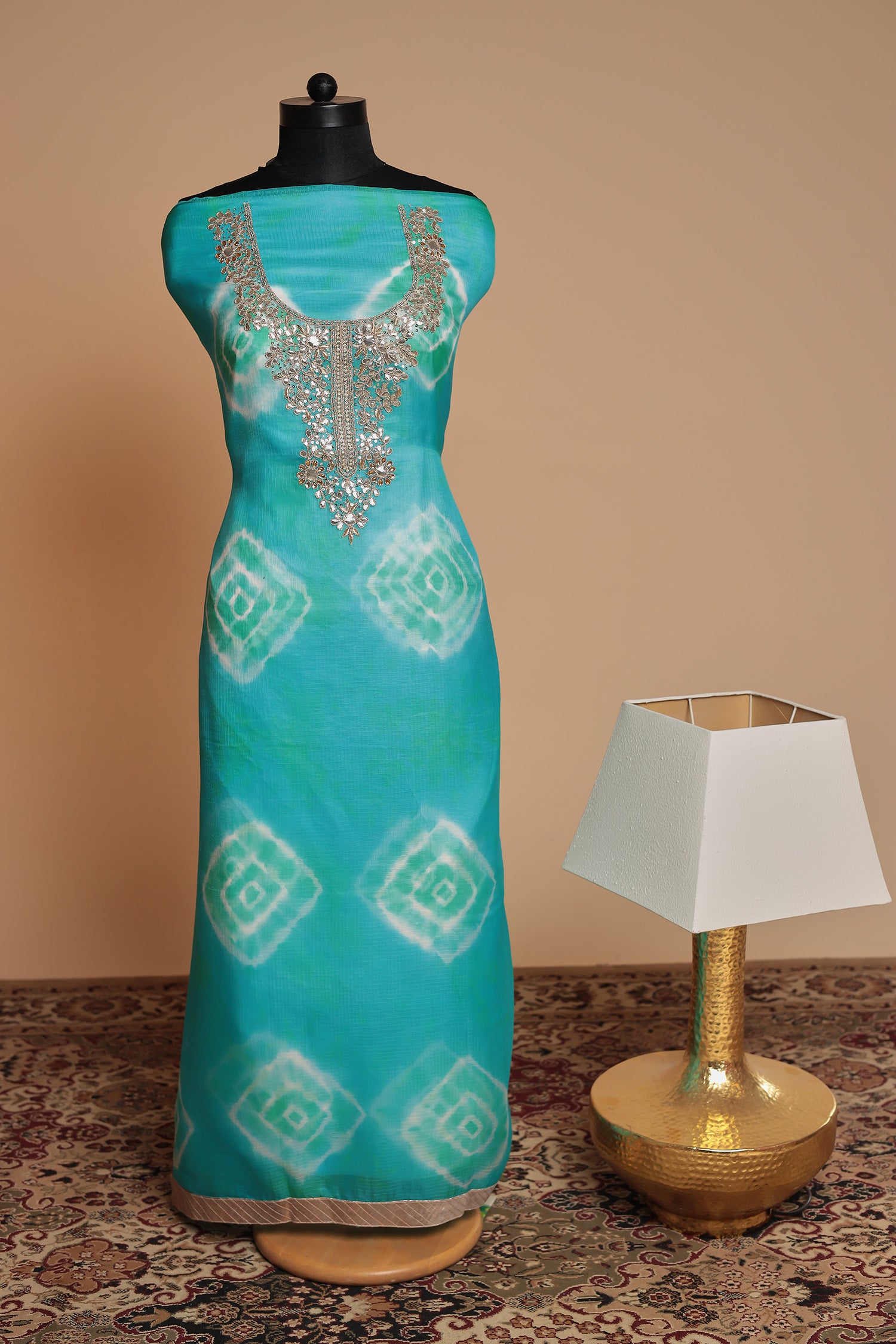 Elevate your ethnic collection with this designer heavy work suit. By searching for Chanderi silk unstitched suit online, customers look for quality and unique designs, and this piece delivers both. This tie-dye silk suit is the perfect choice for those seeking a balance between affordability and luxury. Shop our collection of Fancy Ethnic Wear Online and get ready to be the centre of attention.