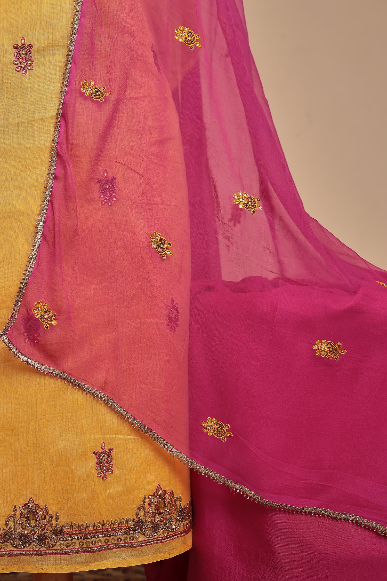 The highlight of this ensemble is the breathtaking Contrast Dupatta in a bold Rani Pink (or Magenta) hue, creating a striking color combination that is a favorite for any celebration. The fabric is adorned with delicate Zari embroidery (or mention your work: sequin work, digital print) which adds a subtle yet sophisticated sparkle, perfect for an evening event or daytime ceremony.